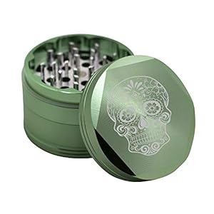 Sugar Skull 4-Piece Metal Herb & Spice Grinder with Pollen Catcher and FREE Scraper – 2.5 Inch Size (Green)