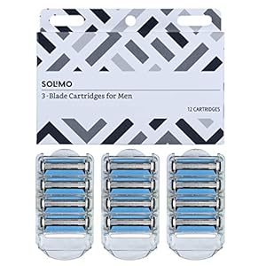Amazon Brand – Solimo 3-Blade Razor Refills for Men with Dual Lubrication, 12 Cartridges (Fits Solimo Razor Handles only…