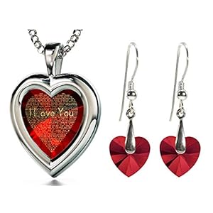 925 Silver Heart Jewelry Set I Love You Necklace 120 Languages Gold Inscribed CZ – Crystal Earrings, 18″