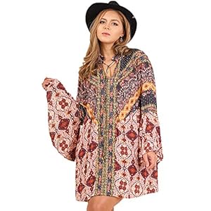 Umgee Womens Berry Multi-Print Trumpet Sleeve Dress
