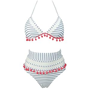 COCOSHIP Women’s Mesh Striped High Waist Bikini Set Tassel Trim Top Halter Straps Swimsuit(FBA)
