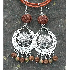 Mandala Hippie Large Earrings with Rudraksha Bead & Flower, Saraswati Shakti Festival Jewelry. HANDMADE
