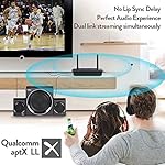 【230ft LONG RANGE】At an amazing long range((B03 Bluetooth transmitter receiver can achieve a range of up to 230ft (70m) line-of-sight in open air and up to 80-110ft (25-35m) indoors) you will still be able to enjoy the safety and security of having your cellphone in your pocket while you listen. We also include aptX technology to eliminate Bluetooth audio delay. Note:Operation range can be affected by Wi-Fi routers, Wireless TV adapters etc. and also depends on receiving device.