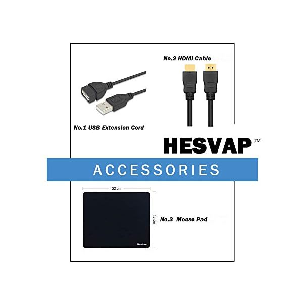 HESVAP accessories including HDMI Cable, USB extension cord and Mouse Pad. 1x USB 2. 0 Type A, 1x HDMI, 2x USB 3. 1 Type A, 1x RJ-45, 1x SD Card Reader, 1x Headphone output/Microphone input combo.
