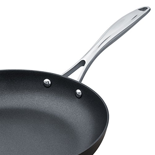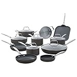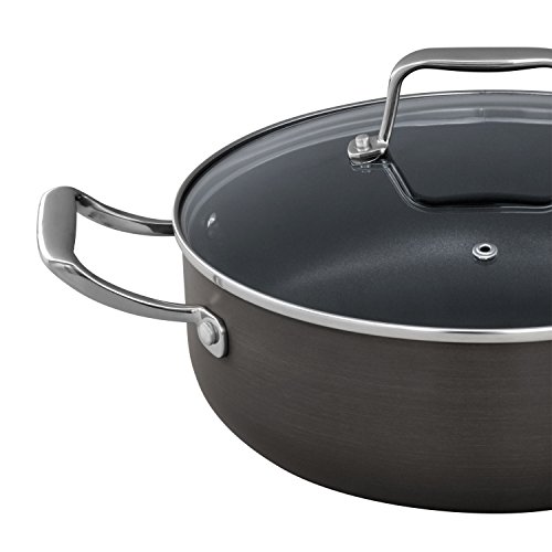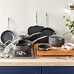 This set of 17 cookware pieces will make your life easier in the kitchen. Hard-anodized aluminum exteriors, non-stick interiors, tempered glass lids, and two spatulas will make it easy to prepare meals for family and friends.