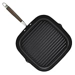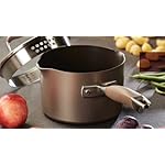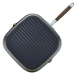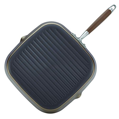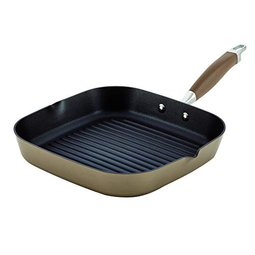 Bring delicious grilled flavors indoors with the Anolon advanced bronze hard-anodized nonstick 11-inch deep square grill pan with pour spouts. The pan features a distinctive bronze nonstick exterior and a rich chocolate-colored nonstick interior, and from base to rim, heavy-duty hard-anodized construction provides the fast, maximized heat distribution great grilling requires. Metal-Utensil-Safe, PFOA-free DuPont autograph 2 nonstick-coated ridges on the interior cooking surface help create attractive grill marks on free-range chicken breasts, sliced vegetables, and more. The channel around the pan sides collects and holds rendered fats and other unwanted liquids away from food, and the pair of corner spouts allow easy pour off when the cooking is done. Best of all, with nonstick inside and out, cleanup is effortless even with the pan’s extra depth. The innovative Anolon Sure Grip rubberized handle provides a confident yet soft grasp when turning juicy bison burgers, is dual riveted for extra strength, and oven safe to 400 Degree F. And this grill pan works well with the cookware sets, stockpots, and other items in the Anolon advanced bronze collection. any Time and any season is perfect for delicious grilling with the Anolon advanced bronze hard-anodized nonstick 11-inch deep square grill pan with pour spouts.