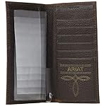 Interior has twelve card slots, three open cash pockets, removable plastic photo display, and an identification window.