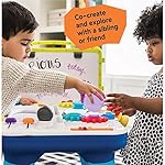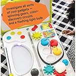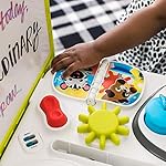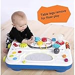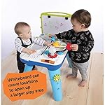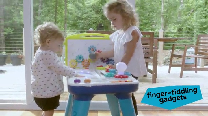 Draw out your child’s naturally curious spirit with Baby Einstein’s Curiosity Table. From removable, spinning gears to color-discovery circuits and flashing lights, the two-sided art and science table will capture your little one’s attention for hours. Watch as the gears connect to make the light bulb turn on! Experiment with color mixing using the mess-free “paint pots.” Your little one will love investigating all the gadgets on this double sided table. It plays more than 65 melodies and introduces vocabulary in English, Spanish or French. Volume adjusts to either high or low settings, or can be turned off completely. When the sounds are turned on, you and your baby will enjoy a better musical experience from the higher end quality speaker. Whether he’s stepping or crawling, the activity station grows with baby. The middle art panel is removable to make more space for baby’s arts and crafts – it even attaches to the end of the table. And removable table legs make it easy to convert the table for floor play. A drawing art surface and a dry erase whiteboard leave plenty of room for big brother or sister to join in on the fun too. Pull up a seat – this play station is fun for parents too!