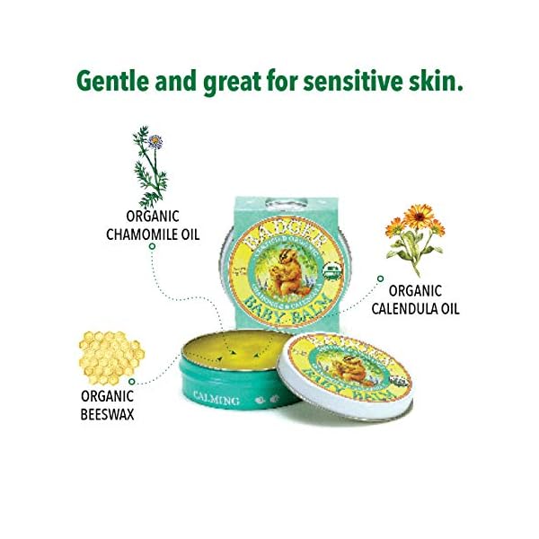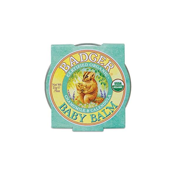 Badger Baby Balm – Organic Soothing & Protection for Your Baby’s Skin No chemicals, synthetics, “fragrance,” parabens, GMOs, or any bad stuff you wouldn’t want on a baby. Calendula and Chamomile are traditional calming and healing herbs for babies. Great for sensitive skin of all ages. Badger Baby Balm is gentle and great for sensitive skin. Care for your baby’s delicate skin with 100% organic, safe and soothing Badger Baby Balm. Formulated with moisturizing oils and calming herbs to nurture and protect sensitive skin. Organic Extra Virgin Olive Oil gently softens and moisturizes even the most delicate skin. The mild scent of true Roman Chamomile calms, while gentle Calendula and Beeswax soothes and protects. Here at Badger, we take baby care seriously and formulated these products using only the safest & purest ingredients. Smooth onto baby’s skin after bath, and to soothe the itching and discomfort associated with diaper rash, cradle cap and dry skin patches. It can also be used for a calming baby massage and for a gentle baby belly rub.