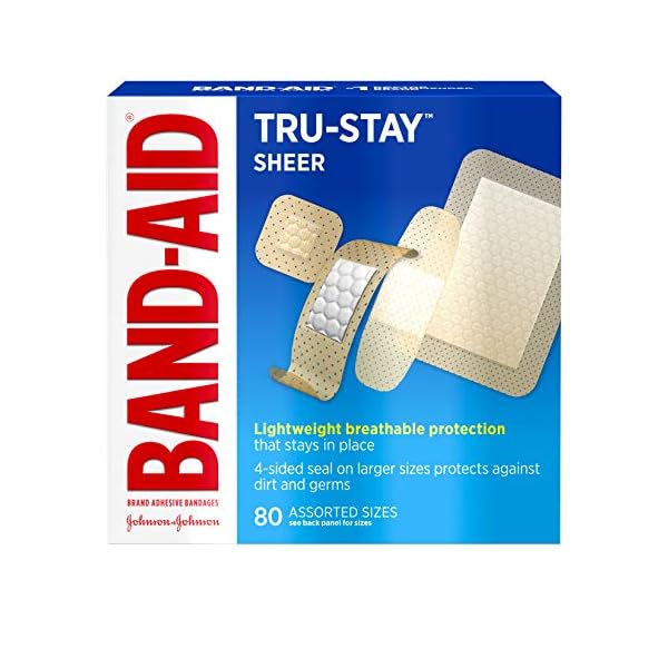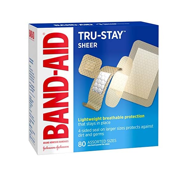 80-count box of Band-Aid Brand Tru-Stay Sheer Strips Adhesive Bandages to help minor cuts and scrapes heal.