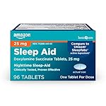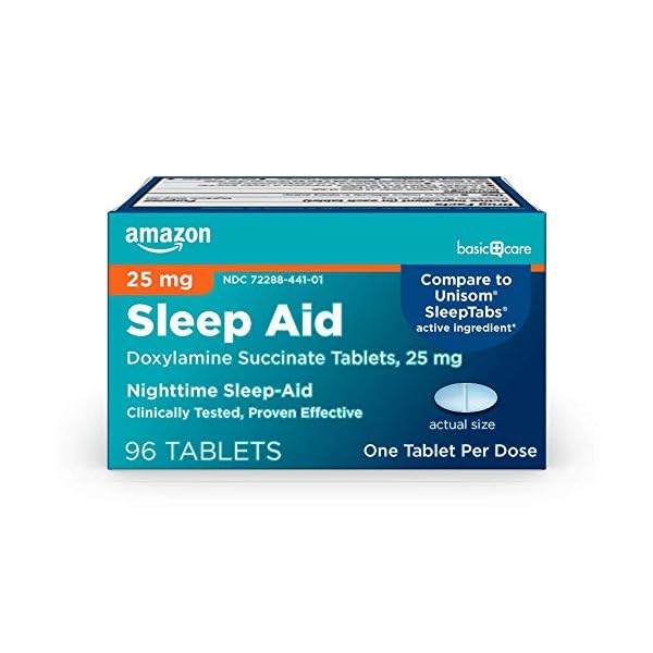 Compare to Unisom SleepTabs active ingredient. Amazon Basic Care Sleep Aid Tablets are a nighttime sleep aid to help to reduce difficulty in falling asleep. Clinically tested and proven effective, Amazon Basic Care Sleep Aid Tablets contain the active ingredient doxylamine succinate 25 mg in each one tablet dose. This nighttime sleep aid contains no pain reliever and is gluten free.