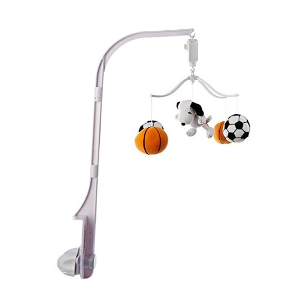 Baby’s favorite black and white beagle can ease your little one to dreamland where he can imagine himself the world’s best basketball or soccer player. Mobile plays Brahm’s lullaby and safely fits all standard and most convertible cribs. There is an optional wall mount feature which provides placement options and extended use. Easy to follow assembly instructions are included.
