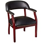 The Boss Captain’s Chair In Black Vinyl offers a traditional look with classic features like hand applied individual brass nail head trim. This Boss Office Products unit wows with a no-sag spring seat that will keep you correctly positioned while sitting in the chair. The sturdy frame is made out of wood with a mahogany finish, while the seats are covered with a soft vinyl. The seats are durable and easy to clean and have the following measurements: 24″ W x 26″ D x 31″ H. Since the chairs weigh just 29 pounds, they are easy to reposition as necessary. Although this model does not have casters, model B9545 does.