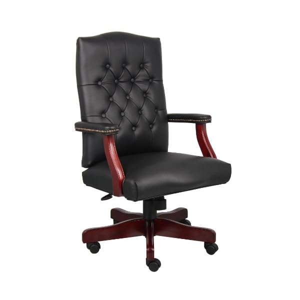 The Boss Classic Black Caressoft Chair With Mahogany Finish by Boss Office Products features five wheels for quickly moving around the office to complete a variety of tasks. The unit measures 27″ W x 28″ D x 43-46.5″ H, where the height can be adjusted to suit your needs. The chair stuns in its classic button tufted styling and beautiful hand applied brass nail head trim. The wood frame is sturdy to provide a long life. Each of these chairs weighs 60 pounds and are able to hold 250 pounds. This unit also matches chair model B959, which is great if adding enough furniture to outfit an office.