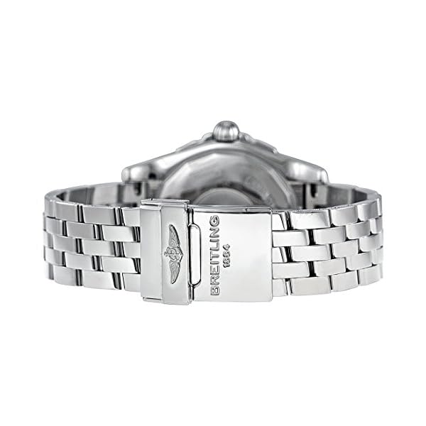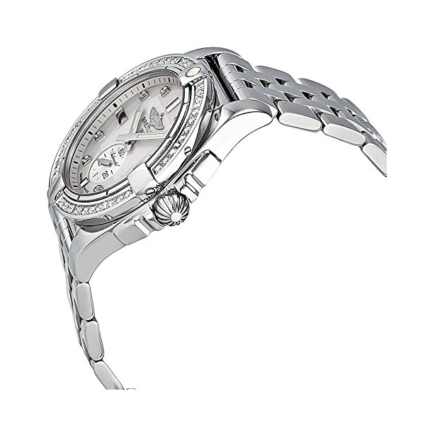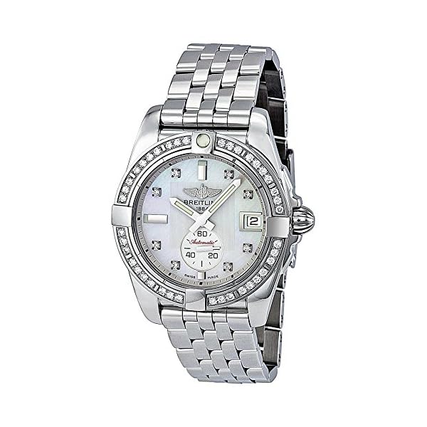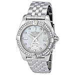 Stainless steel case with a stainless steel bracelet. Fixed stainless steel bezel set with diamonds. Mother of pearl dial with luminous silver-tone hands and diamonds hour markers. Index markers at the 6, 9 and 12 o’clock positions. Minute markers around the outer rim. Dial Type: Analog. Luminescent hands. Date display at the 3 o’clock position. Seconds sub-dial at the 6 o’clock position. Automatic movement with a 42 hour power reserve. Scratch resistant sapphire crystal. Screw locked crown. Solid case back. Case diameter: 36 mm. Case thickness: 12.3 mm. Round case shape. Band width: 16 mm / 18 mm. Deployment with push button clasp. Water resistant at 100 meters / 330 feet. Functions: date, hour, minute, second. Casual watch style. Watch label: Swiss Made. Breitling Galactic 36 Mother of Pearl Dial Diamond Unisex Watch A3733053-A717SS.