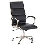 With an elegant design and a variety of color options to choose from, the Bush Business Furniture Modesto High back leather executive Office chair is the perfect seating solution to reflect your personal style. The cushioned bonded leather upholstery provides top-notch comfort with a sophisticated appearance that works well in any professional environment. The high back design limits strain on the upper back, shoulders and neck to reduce fatigue and improve productivity during a long workday. Armrests are ergonomically contoured and include soft padded upholstery for maximum comfort. This desk chair features a tilt mechanism that can be customized by turning a knob underneath the seat to increase or decrease the amount of tension felt while reclining, and a convenient Lever instantly adjusts the Height to individual preference. Five dual-wheeled casters allow the chair to roll freely throughout your workspace while 360 degree swivel control gives full range of motion. In addition to offering a stylish complement to the bonded leather, The chrome steel base and arms provide long-lasting durability with a weight capacity of 275 pounds. The commercial-grade high back leather executive Office chair is tested to meet ANSI/BIFMA quality standards for safety and performance and is backed by the Bush Business Furniture 5 year manufacturer’s .