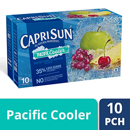 Capri Sun Pacific Cooler Mixed Fruit Flavored Juice Drink Blend takes hydration to new heights in fun drink pouches filled with all natural ingredients. This ready to drink beverage comes packed with a kid-friendly fruity taste using natural flavors. Made with no artificial colors, flavors, preservatives or high fructose corn syrup, this drink is as epic as the kids who drink it. Each drink single serve pouch contains 30% less sugar than leading regular juice drinks (this product 13 grams of sugars; leading regular juice drinks 22 grams of sugars per 6 fluid ounce serving). This thirst-quenching drink for kids comes conveniently packaged in pouches with straws, so you can sip the refreshing flavor anywhere. A convenient 10 count easy-open fridge pack helps keep your refrigerator neat