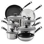 Set includes: 1-quart saucepan with lid, 2-quart saucepan with lid, 3-quart saucepan with lid, 6-quart stockpot with lid, 3-quart sauté pan with lid, 8. 5-Inch frying pan, 10-inch frying pan, 12. 5-Inch frying pan