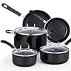 Set includes: 1-quart saucepan with lid, 2-quart saucepan with lid, 3-quart saucepan with lid, 6-quart stockpot with lid, 3-quart sauté pan with lid, 8. 5-Inch frying pan, 10-inch frying pan, 12. 5-Inch frying pan