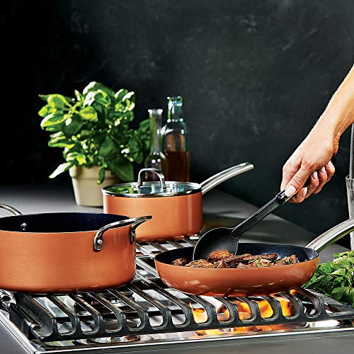 Copper Chef Black Diamond Collection from Copper Chef, the #1 best selling cookware brand in the United States Our 10-Pc. Cookware Set Give you every pot and pan you need to enjoy a healthier, easier alternative during daily cooking. Deep fry chef style chicken right on your cooktop, sauté and lightly fry food with minimal to no oil, roast for gatherings, bake your favorite desserts, create soups, stews, casseroles, and more. Copper Chief cookware features a PTFE & PFOA free ceramic coating, perfect for creating healthier food and preserving taste while helping to reduce fat and calorie intake. There’s no added oil required. The non-stick Cerami-Tech coating combined with the induction bottom distributes high heat quickly and evenly to the entire cooking surface to perfect steaks, vegetables, omelets, pancakes, casseroles, soups, gravies, and more. Use both the 8 inch frying pan and 10inch frying pan in your Copper Chef Set for golden sautéed chicken or sear pork chops on the stove top, then bake to desired degree of doneness – all in the same pan. Use your 2-quart sauce pan for gravy added sauce, stews, soups, lentils, rice and so much more. If you’re cooking for a crowd, the 4.5-quart casserole pan gives you the space you need for roasting, baking beautiful entire chickens, ribs, casseroles, mac & cheese, bread pudding, and much more. Whether cooking a simple dinner for family or hosting friends, your Copper Chef Black Diamond frying pans and pots make cooking healthier, easier, and even more delicious. As Seen on TV. *Source: The NPD Group / Retail Tracking Service, U.S. Sales, 12 Months Ending December 2017