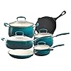 Set includes: 1-quart saucepan with lid, 2-quart saucepan with lid, 5-quart Dutch oven with lid, 8. 5-Inch deep frying pan 11. 25-Inch deep frying pan, slotted turner, slotted Spoon, pasta Fork