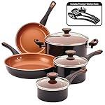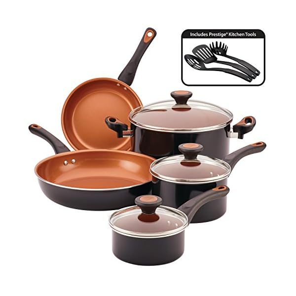 Cook up family-sized weeknight and weekend meals with the superior Ceramic nonstick cookware features of the Farberware(r) glide(tm) 11-Piece copper ceramic nonstick cookware set. This essential collection of saucepans, frypans and a Dutch oven is constructed from fast and even-heating aluminum, and boasts copper slide(tm) technology for effortless nonstick food release and easy cleanup of even the stickiest recipes. The copper ceramic nonstick is dishwasher safe for easy cleaning, saucepans include snug-fitting glass lids to seal in heat and moisture, and easy-hold cookware handles provide a comfortable, confident grip to flip, fry, and sauté with ease. Oven safe to 350°f for stove to oven versatility, the pots and pans are backed by Farberware lifetime warrantee. Plus, the set boasts three Prestige kitchen utensils including a slotted turner, slotted spoon and pasta fork so you can start cooking right out of the box. The full nonstick pots and pans cookware set includes: a 1-quart saucepan with lid, 2-Quart saucepan with lid, 5-quart Dutch oven with lid, 8. 5-Inch deep frying pan 11. 25-Inch deep frying pan, slotted turner, slotted spoon, and a Pasta fork. For great performance and long-lasting durability, reach for the Farberware glide 11-Piece copper ceramic nonstick cookware set.