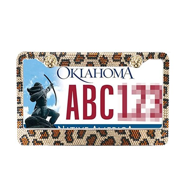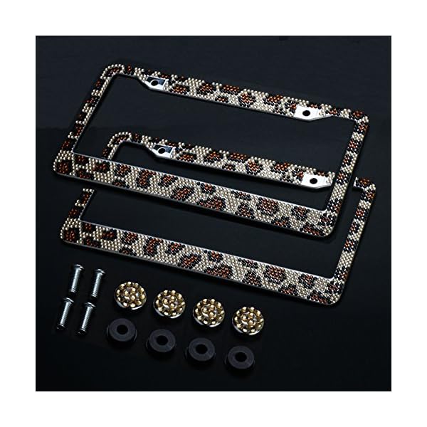 Come with 2 leopard rhinestone license plate frame,4 stainless steel Theft-proof screws,4 rhinestone caps,4 cushion rings