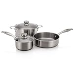 Frigidaire stainless steel cookware is designed to work perfectly with any cooking surface. The set features a 3-quart sauté pan, a 1. 5 quart sauce pot with lid and a 5-quart stock pot with lid. Pans and lids are dishwasher safe for convenience and each handle is riveted for durability. Vented glass lids allow visibility during cooking. Brushed stainless steel with a heavy aluminum core ensures fast even heating on gas, electric, and induction cooktop.