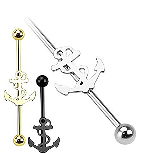 Gold, 14GA (1.6mm) x 1&1/2″ (38mm), Anchor Center Surgical Steel Industrial Barbell Surface Bar Earring