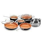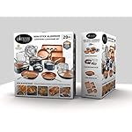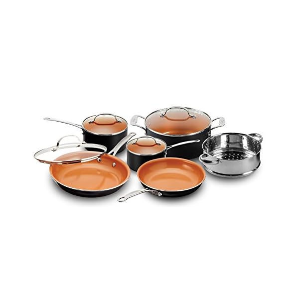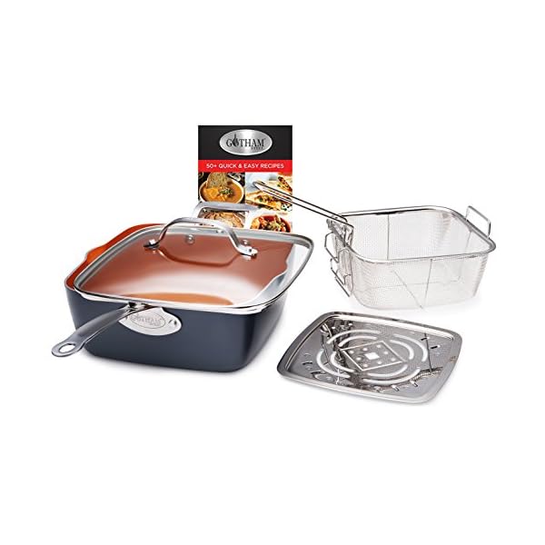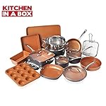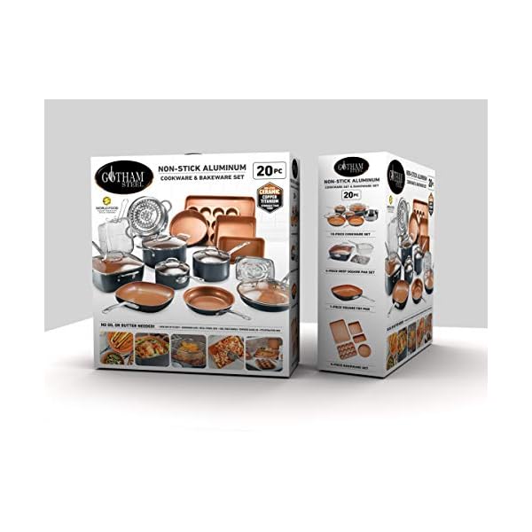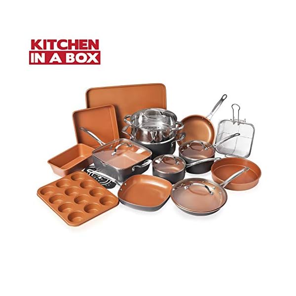 Gotham Steel 20 Piece All in One Kitchen Cookware + Bakeware Set with Nonstick Durable Ceramic Copper Coating Includes Skillets, Stock Pots, Deep Square Fry Basket, Cookie Sheet and Baking PansComplete kitchen in a box includes a complete suite of fry pans, stock pots, sauce pans, bakeware pans, steamers and more (see below for complete list of contents)Award winning Ti-Cerama coating, derived from ceramic and reinforced with titanium ensures the ultimate release — everything just slides right off the pan, no need for oil or butterUltra-durable, scratch-proof & metal utensil safePlease note, the components of the set may be individually wrapped and placed in a larger box. Lightweight design makes for a comfortable cooking experienceOven safe up to 500° F, The pots and pans are suitable for all stovetops, except inductionDishwasher safe Makes for effortless clean upStay cool handles are cool to the touchHealthy & toxin free this cookware set is 100% free of PFOA, PFOS, PTFE, lead & cadmium for an , healthy experience10-year Gotham Steel Cookware is built for years of use and backed by a 10 year limited Contents this set includes 8. 5″ fry pan, 10. 25″ skillet with tempered glass lid, 1. 5 quart sauce pan with tempered glass lid, 2. 5 quart sauce pan with lid, 5 quart stock pot with lid, stainless steel steamer rack, 9. 5″ square shallow pan, 9. 5 deep square casserole pan with tempered glass lid, stainless steel frying basket, steamer insert, 12 x 17 XL cookie sheet, 9. 5 x 9. 5 square baking pan, loaf pan, 9. 5 round baking pan, 12 cup standard sized muffin pan