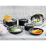 Includes: 8.5 fry pan, 10.25 fry pan with lid, 1.5 quart sauce pan w/ lid, 2.5 quart sauce pan w/ lid, 5 quart sauce pan w/ lid, stainless steel steamer tray insert.