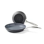 The GreenLife classic gourmet Pro hard anodized healthy ceramic nonstick PFOA free dishwasher safe oven safe stainless steel handles 8-inch and 10-inch omelet fry pan cookware set, 2-Piece, Grey is both durable and convenient. The professional quality hard anodized body has excellent heat conduction and a sturdy base. The ergonomic stainless steel handle helps this cookware set become oven safe up to 392°f. Thermolon is manufactured without pfas and PFOA, does not contain any lead or cadmium and allows for less fats and oils to be used. It gives you ideal frying results with lower heat settings. A matte dishwasher safe coating gives this cookware set added convenience. This set includes: 8-inch frypan and 10-inch open frypan.