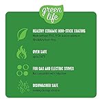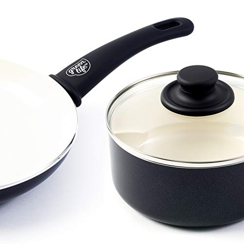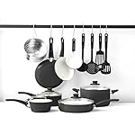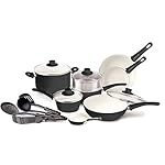 The GreenLife soft grip 16pc ceramic non-stick cookware set, turquoise makes the perfect addition to any kitchen. The high performance Thermolon ceramic non-stick coating is long lasting and easy to clean, made without pfas, PFOA, lead or cadmium. The aluminum reinforced body adds a touch of style to your kitchen, while the matching soft-grip handles provide much-needed Comfort. The glass lids allow for convenient monitoring while cooking and the dishwasher-safe construction makes cleanup a breeze. This set includes: 4″ mini frypan, 7″ open frypan, 9.5″ open frypan, 1Qt covered saucepan, 2Qt covered saucepan, 5Qt covered stockpot, 2.5Qt covered saute pan, 7″ stainless steel steamer, and 4 kitchen utensils.