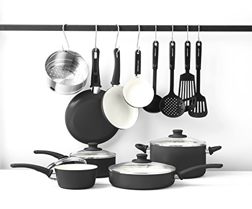 SET INCLUDES — 4” mini frypan, 7” open frypan, 9.5” open frypan, 1QT covered saucepan, 2QT covered saucepan, 5QT covered stockpot, 2.5QT covered sauté pan, 7” stainless steel steamer and 4 kitchen utensils.
