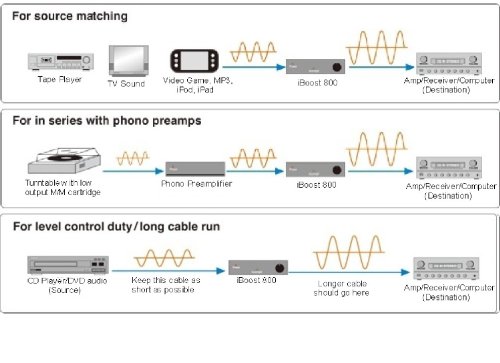 The iBoost 800 was designed to solve an increasingly annoying issue, how to get a quality line level audio output from a portable or computer device that is as high as the audio output typically found with a good CD player. Most MP3 players (including iPodsTM) output a signal through the headphone jack that is suitable for headphones, but not quite for your stereo receiver, home theater system, DJ mixer etc. When plugging these devices into a home audio system, the flaw is easily noticed. The iBosst 800 brings the audio output level of these small devices up to a level suitable for your particular audio equipment. Increases the line level output by up to 20dB for any audio component with an inherently low level output, such as that found with the headphone output jack of an MP3 player, iPodTM, iPadTM, iPhoneTM, computer sound card, etc. Is also a great solution for boosting audio levels on turntables equipped with low level output cartridges when used in series with a phono preamplifier. Other applications the iBoost 800 is suitable for is the addition of a volume control between a line level source and a power amp which has no output volume adjustment of its own. Also for providing the gain needed to drive a long cable when connecting a TV’s audio output to a stereo located a long distance away. Simply connect the line level output on your source device to either the 3.5mm stereo input jack on front panel or the RCA inputs on the rear. DIN IN/OUTPUTS jacks are also provided in the rear panel. Connect the output of the iBoost 800 to your amplifier, receiver, or whole-house audio controller, etc. Increase volume up to 20dB by adjusting the rotary volume control on front panel clockwise. When utilizing the front 3.5mm stereo input jack, the rear RCA inputs will be bypassed. Package Contents: iBoost 800 Line Level Amplifier, 12VDC US Power Adapter, 3.5mm Stereo to RCA adapter, 3ft Stereo RCA patch cable.