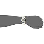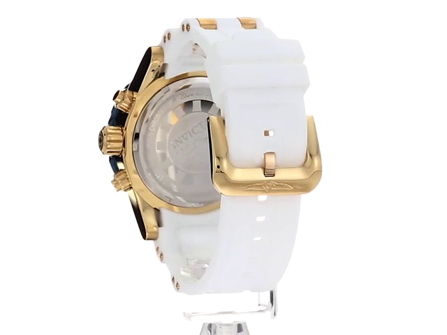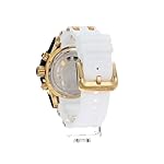 Silver chronograph with 60 sec, 60 minute and 24hr subdials with date display, White rubber band with gold tone stainless steel accents, Push down crown
