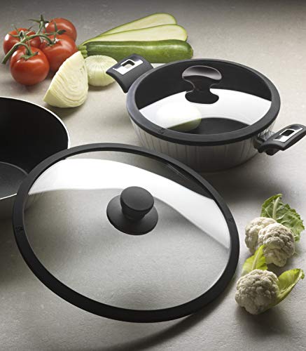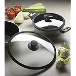 Tempered glass with silicone edge and built-in vent; Bakelite knob with brown soft touch