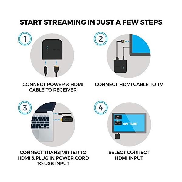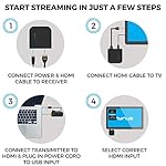 Easy to install plug ‘n play set up eliminates the need to install expensive, inconvenient cables. No software or WiFi connection required. Transmitter: 1 x HDMI input, Receiver: 1 x HDMI output
