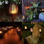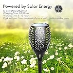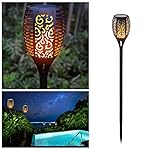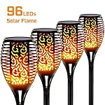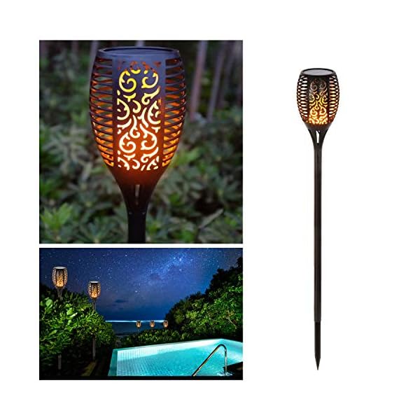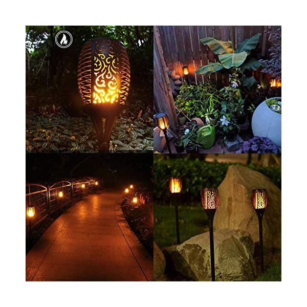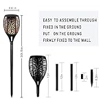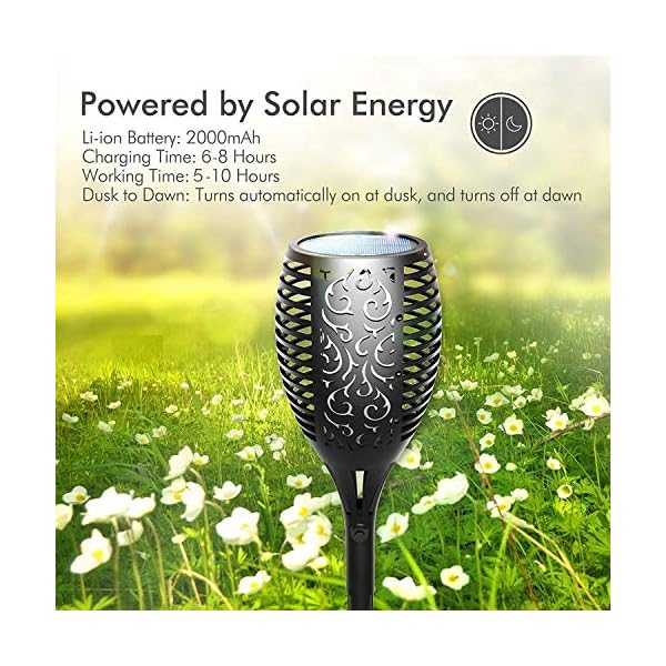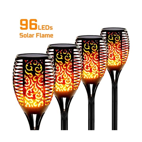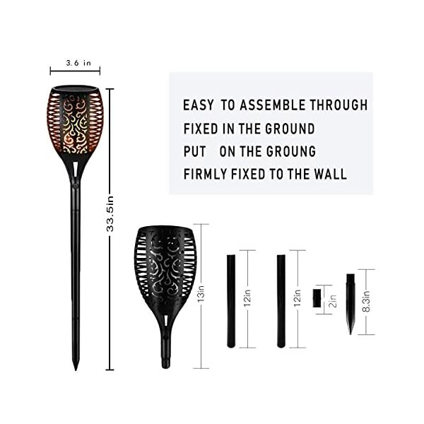 Dancing Flame Design – A safe alternative to the real “flames” — 96pcs LEDs in the light cast a safe, soft, mood-enhancing glow.The actual height of the solar torches is 33.5 inches.(Accessories include) If it doesn’t work for a while, because Battery capacity reduces over time, switch the light off for 3-5 sunny days in order to boost the batteries. Weather will affect these solar lights` working time