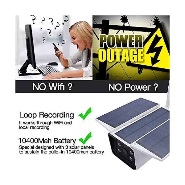 Panoraxy 1080P Wireless Outdoor Solar Security Camera is an ideal security solution for your property with day and night vision. Special designed with 3 solar panels to sustain the build-in 10400mah battery when it drains out under direct sunlight. It works through WiFi and local recording, you can hear and see what you care anywhen(day and night), anywhere through IOS and Android smartphone/tablet.