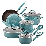 Get high performance and durability in the kitchen with the Rachael Ray Cucina Hard Enamel 12-Piece Nonstick Cookware Set. Crafted with sturdy hard enamel porcelain exteriors and durable aluminum construction that promotes fast, even heating, these versatile pots and pans incorporate the easy-to-use functionality and time-saving solutions Rachael is known for. Color meets convenience with the distinctive espresso-colored, PFOA-free nonstick that releases foods effortlessly, complements the exteriors, and cleans up easily. Rubberized stainless steel handles on the cooking set are dual riveted for added strength, and shatter-resistant glass lids seal in heat and flavor. Oven safe to 400°F, the nonstick cookware is a welcome addition to other cookware and serveware pieces in the Rachael Ray Cucina collection. Prepare delectable dishes for loved ones with the warm and rustic-styled nonstick cookware in the Rachael Ray Cucina 12-Piece Hard Enamel Nonstick Cookware Set