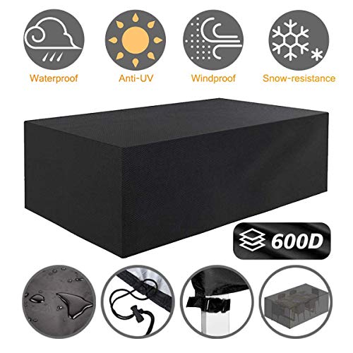 ☂【Upgarded Heavy Duty Waterproof Material】☂-Made of 600D high density nylon oxford fabric which are weatherproof and dust-proof, effectively prevent furniture from getting wet due to rain and snow. About the patio table cover’s material of which is 600D is more thicker and durable than other material, not easy to tear, protect your patio furniture from dirt, dust, rain, bird dropping, snow etc.