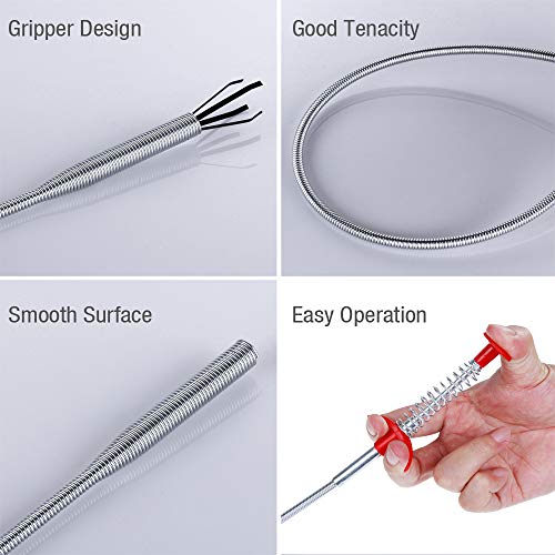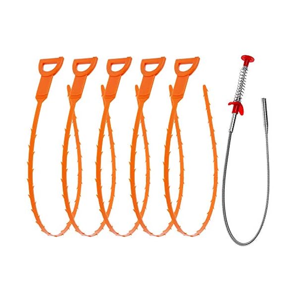 1 stainless steel drain cleaner captures solid obstructions and 5 plastic drain snakes tools hook hair and debris