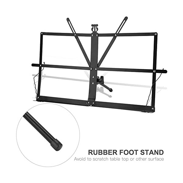 This music stand desk can rest on any flat surface when unfolded it. Ideal for classroom, private studio and more. Rubber foot on back support to prevent any scratching of table top or other surface. Foldable design, easy and convenient to carry with. Made of quality metal, making this product a sleek and reliable music sheet stand.