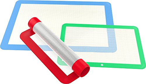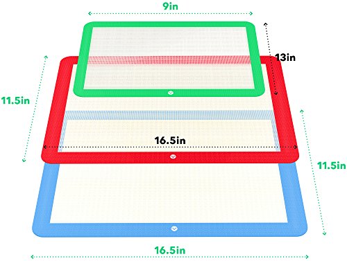 QUARTER and HALF SHEETS BAKING MATS – Our 3 piece baking mat set includes two standard 11.5 x 16.5 inch half sheet mats and one 9 x 13 inches quarter sheet mat for creating homemade goodies at any size. Designed with colorful trim for fun baking with kids