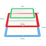 Ditch the tin foil and embrace the nonstick miracle of the Vremi Flour Power Baking Mats. This reusable essential bakeware set has three clear flexible silicone mats sized for standard half and quarter cookie sheets, and trimmed in bright cheery red blue and green colors.
