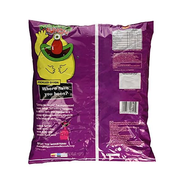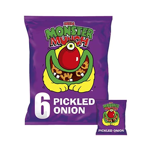 Walkers MEGA Monster Munch : Huge Chunks of Pickled Onion flavor baked corn snack.